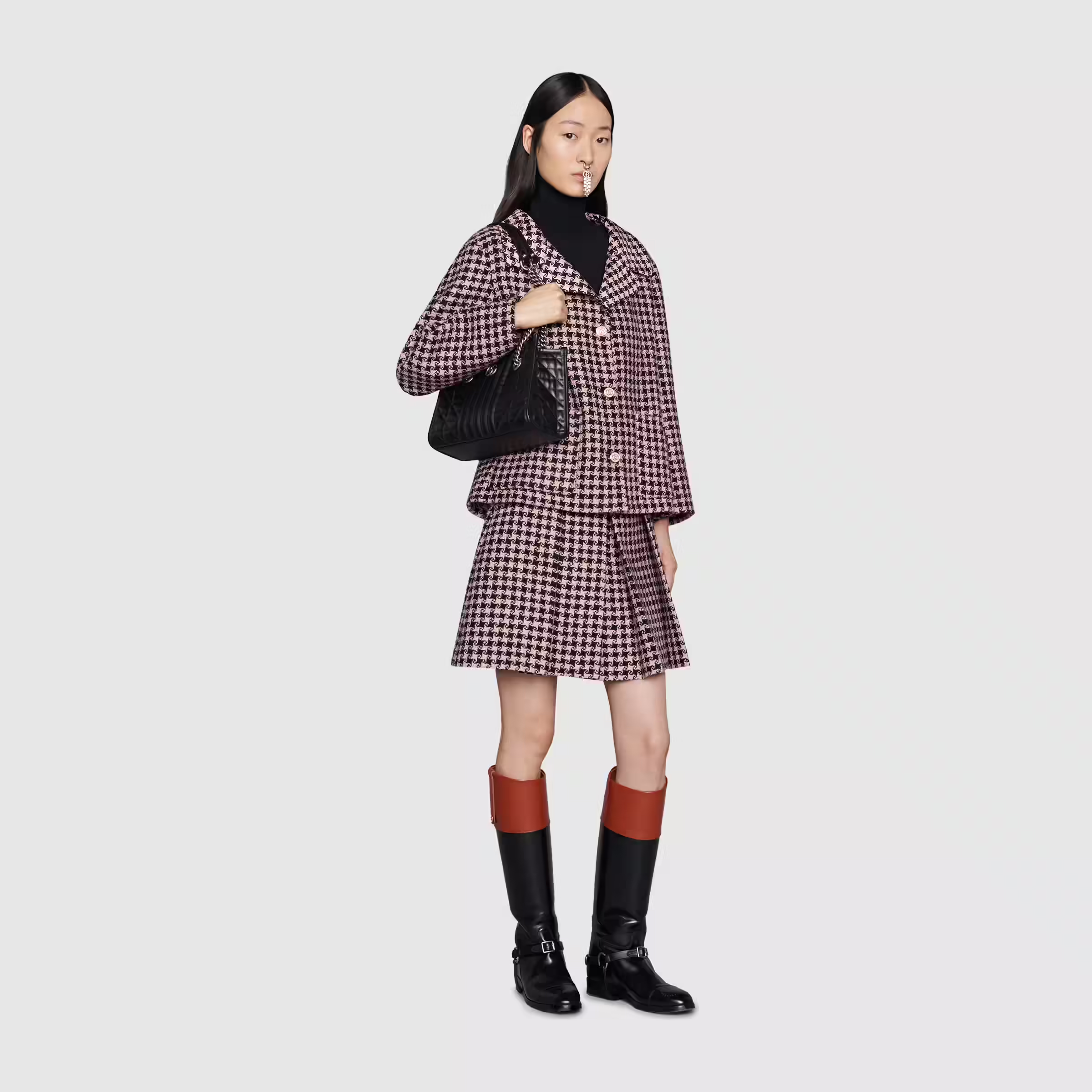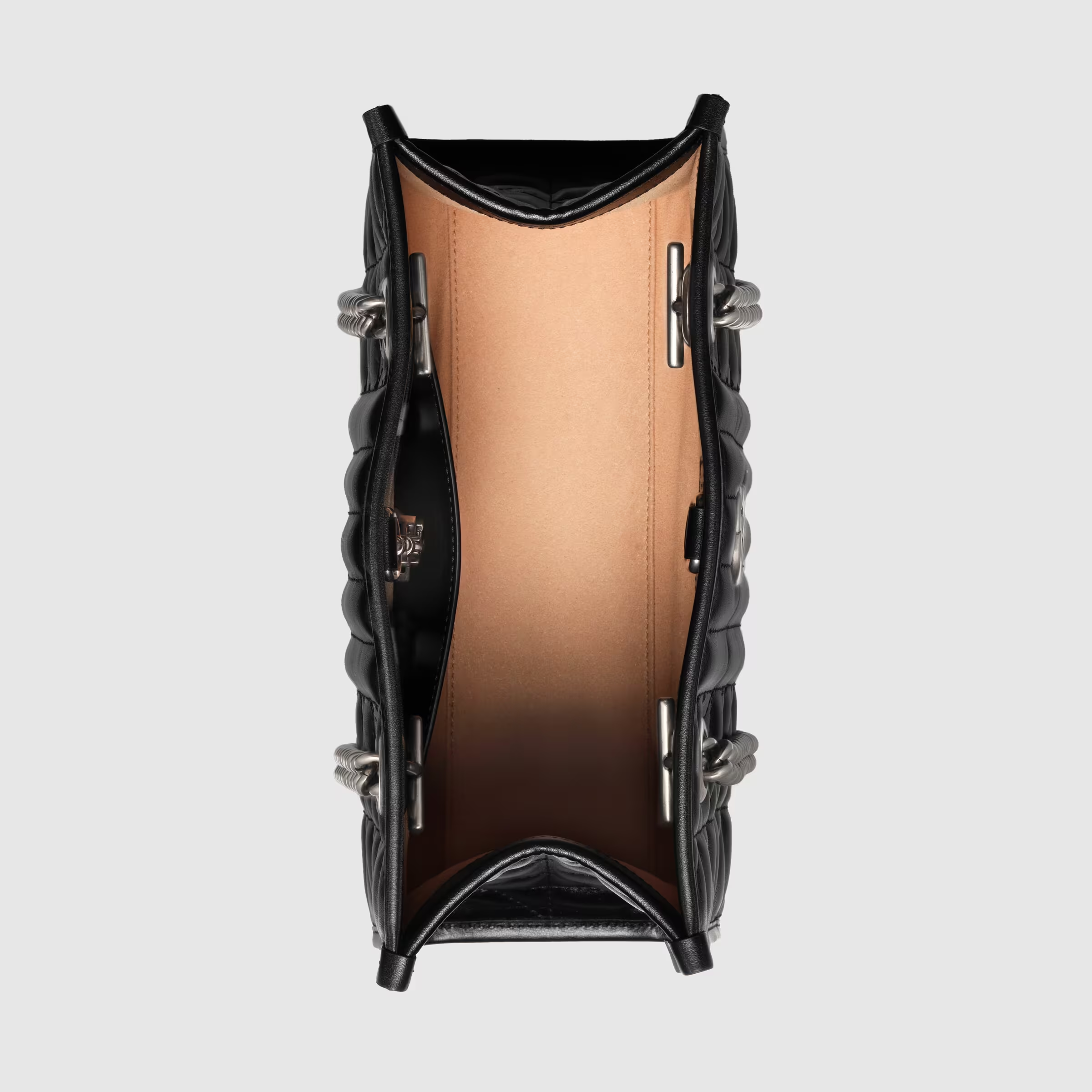 Luxury Aria explores the House’s archives, telling Luxury ‘s story though a mix of archival and contemporary elements. The hand was introduced in one of the Creative Director’s first fashion shows and each season its design evolves through the lens of the latest collection. Here, the tote bag is presented in black matelassé leather with silver-toned hardware.