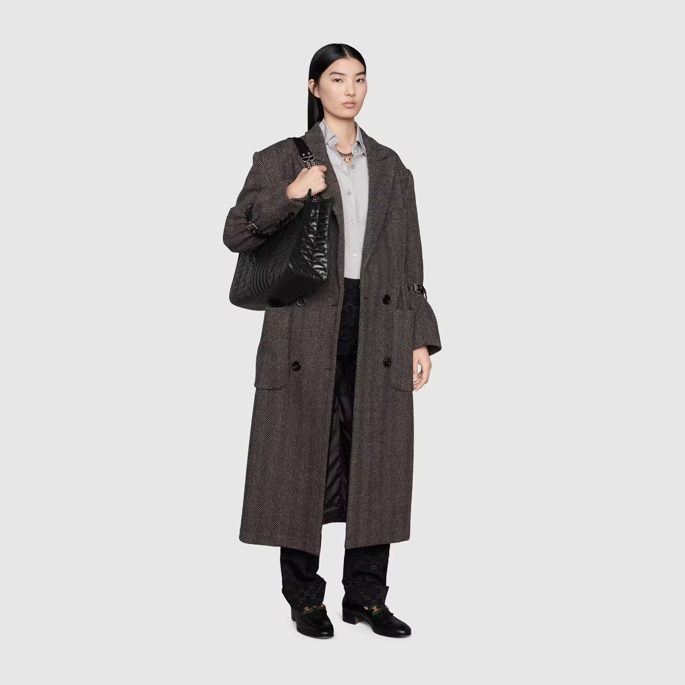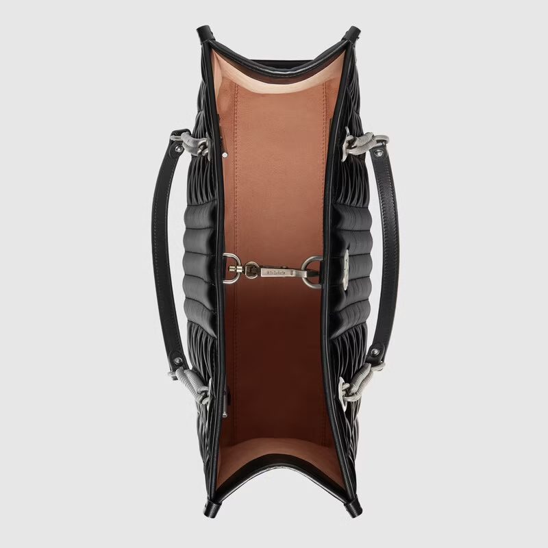 Luxury Aria explores the House’s archives, telling Luxury ‘s story though a mix of archival and contemporary elements. The hand was introduced in one of the Creative Director’s first fashion shows and each season its design evolves through the lens of the latest collection. Here, the tote bag is presented in black matelassé leather with silver-toned hardware.