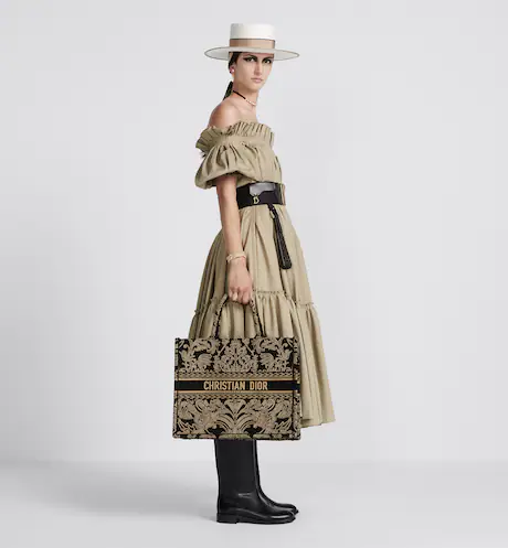 Introduced by Maria Grazia Chiuri, Dior’s Creative Director, the Dior Book Tote has become a staple of the Dior aesthetic. Designed to hold all the daily essentials, the style is fully embroidered in a black and beige Ornamental motif with a Cornely effect, inspired by Andalusian baroque in a graphic spirit. The design is adorned with the ‘CHRISTIAN DIOR PARIS’ signature on the front and exemplifies the House’s signature savoir-faire. The large tote may be carried by hand or worn over the shoulder.