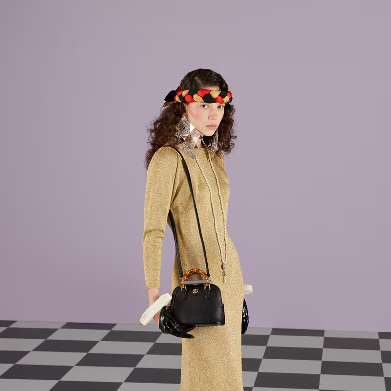 Combining recognisable elements of the House, the mini tote bag is defined by its bamboo handles and Double G hardware. Crafted from black leather, the accessory is further accentuated by two bands, a playful reference to the bands used to keep handles in shape.