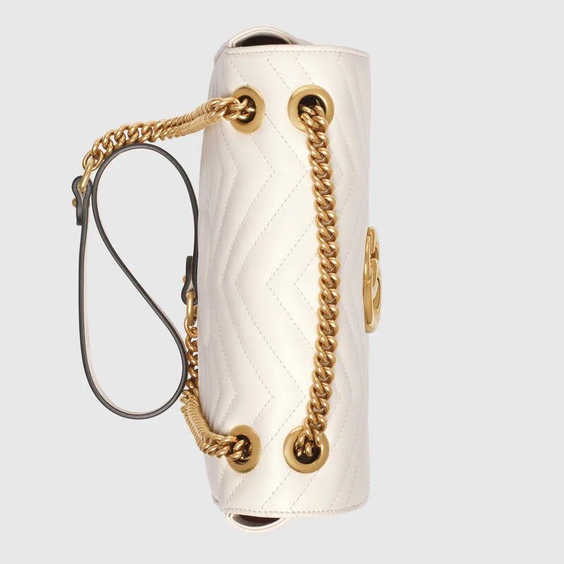 The small hand camera bag has a softly structured shape and a flap closure with Double G hardware. The sliding strap can be worn multiple ways, changing between a shoulder and a top handle bag. Made in matelassé leather with a heart on the back.