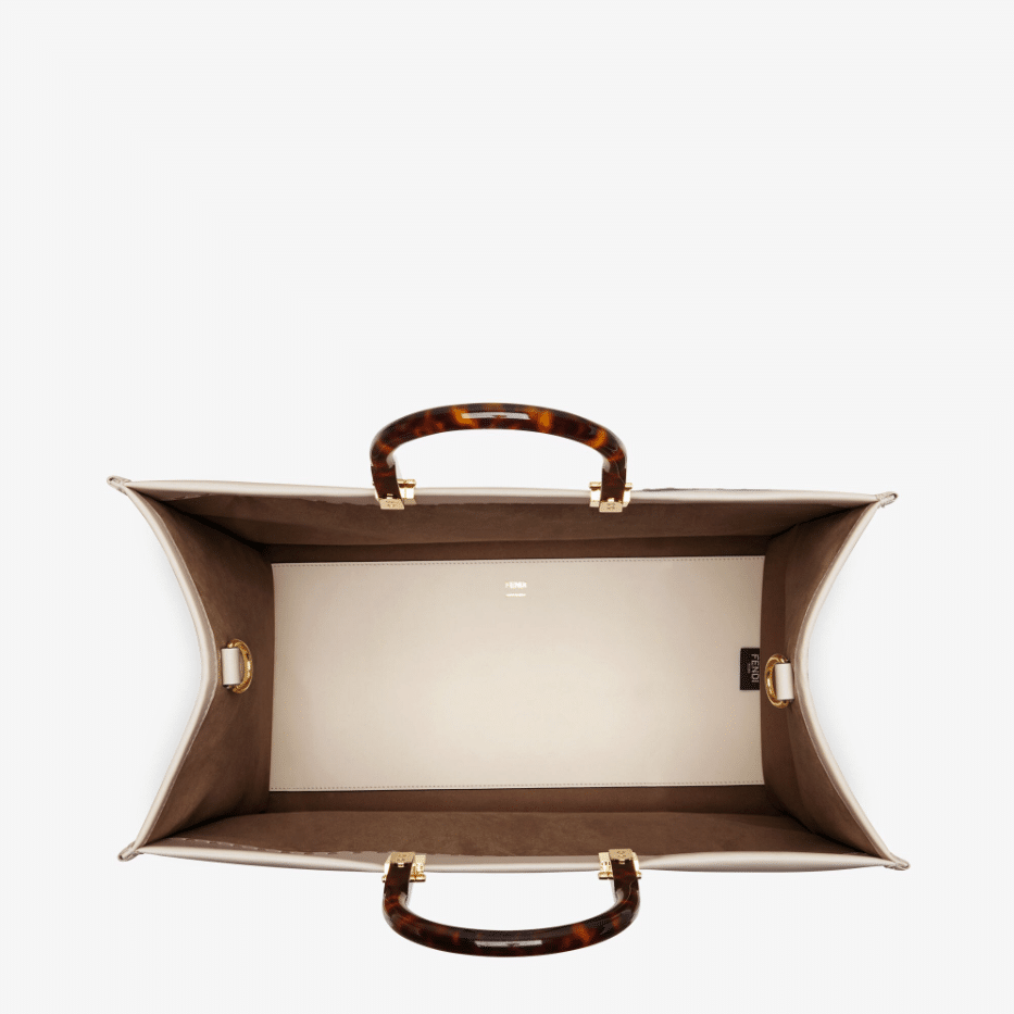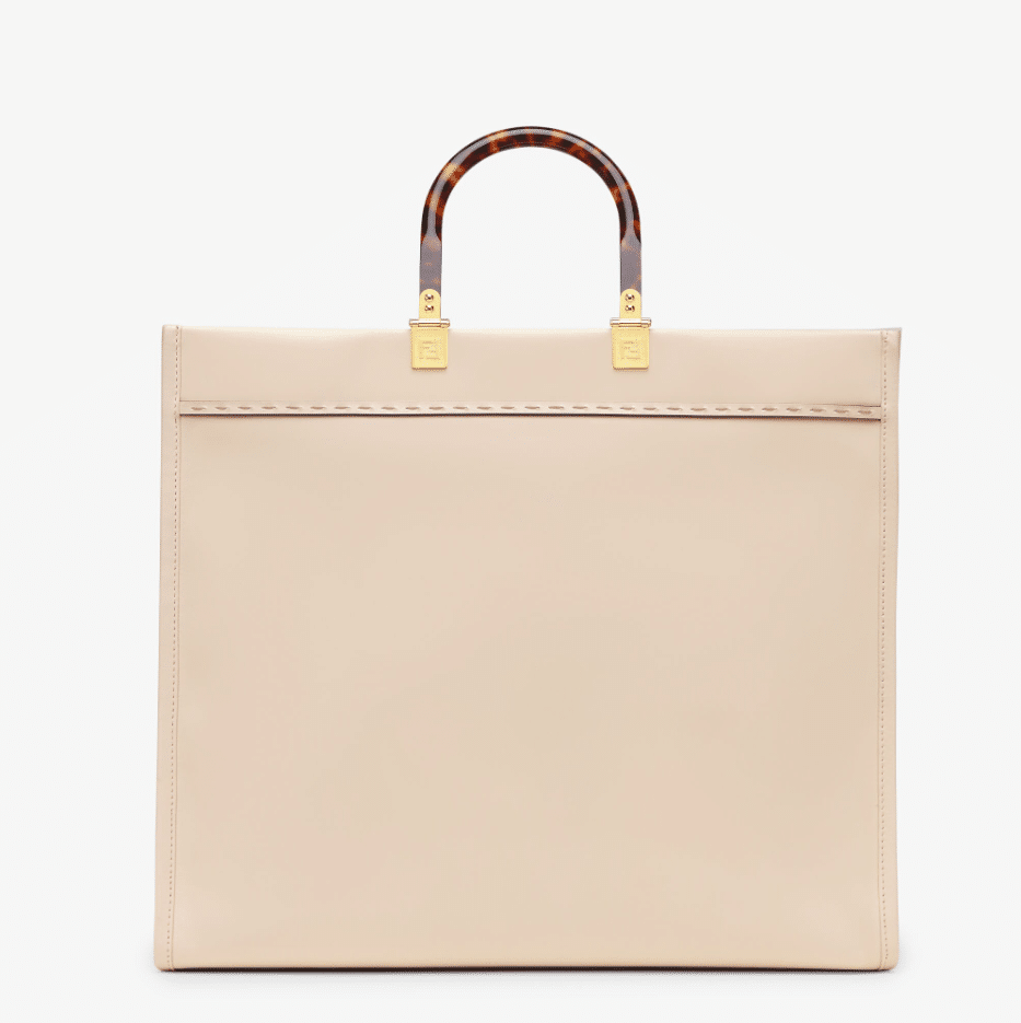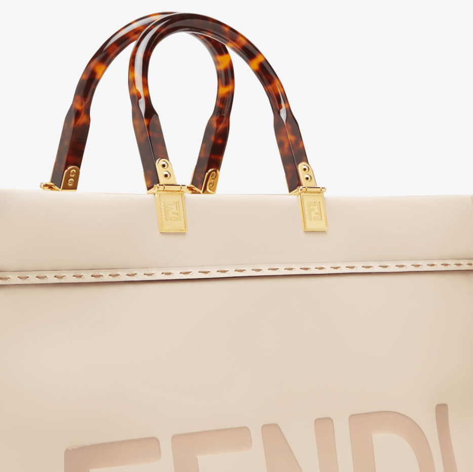 Sunshine Shopper bag made of powder pink leather with hot-stamped FENDI ROMA lettering and stiff tortoiseshell effect plexiglass handles.